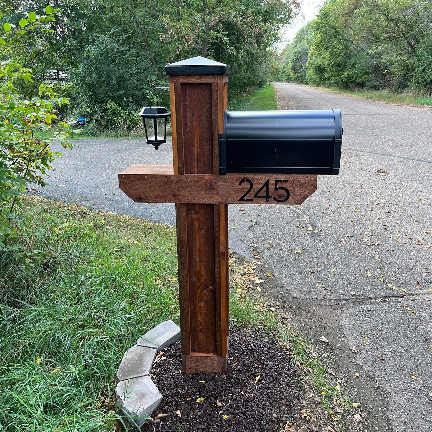 Custom mailbox post for a customer, made from cedar boards. Four cedar boards create the main post, with strips of cedar attached around the edges. A cross post is mounted 60% of the way up with one side longer than the other to accommodate the mailbox. A small exterior lattern is added to the back to balance the look of the front and a solid powder-coated iron cap was mounted to the top of the post.